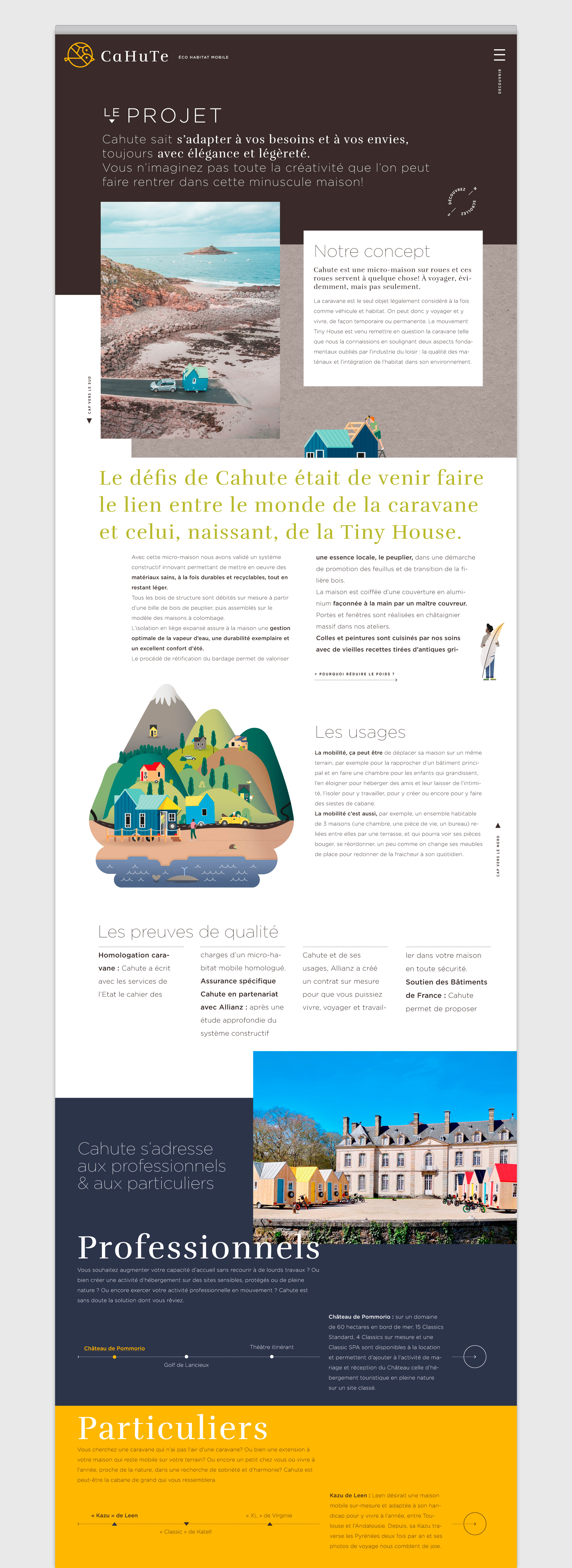 Cahute est un concept d’éco habitat mobile. De fabrication artisanale, écologique et homologuée, cette micro-maison offre une solution idéale d’hébergement sur des sites naturels, isolés ou écologiquement fragiles. Cahute recrée un sentiment d’harmonie entre l’homme, son habitat et l’environnement. Cocon mobile aux allures de petite cabane, cet objet hybride conjugue avec élégance, confort et liberté dans un langage authentique et singulier. Ce qui lui manquait ? Un positionnement de marque prêt à incarner et révéler cette marque prometteuse, la démarquer nettement des codes du marché des Tiny House par son caractère unique sur le marché.